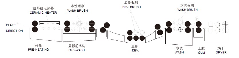 10. 显影前水洗附有毛刷系统:显影后水洗则采用专门设计的Moleton毛刷,更能保证彻底清除PS版面之残渣。